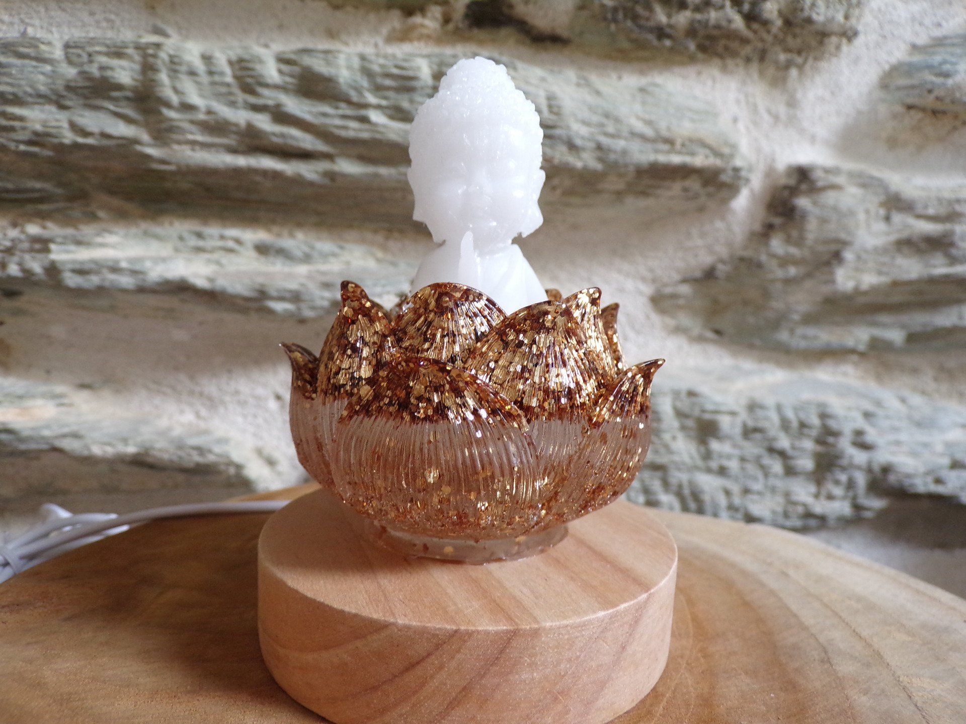 bouddha dans sa fleur de lotus à paillette dorée en résine sur socle lumineux branchement USB