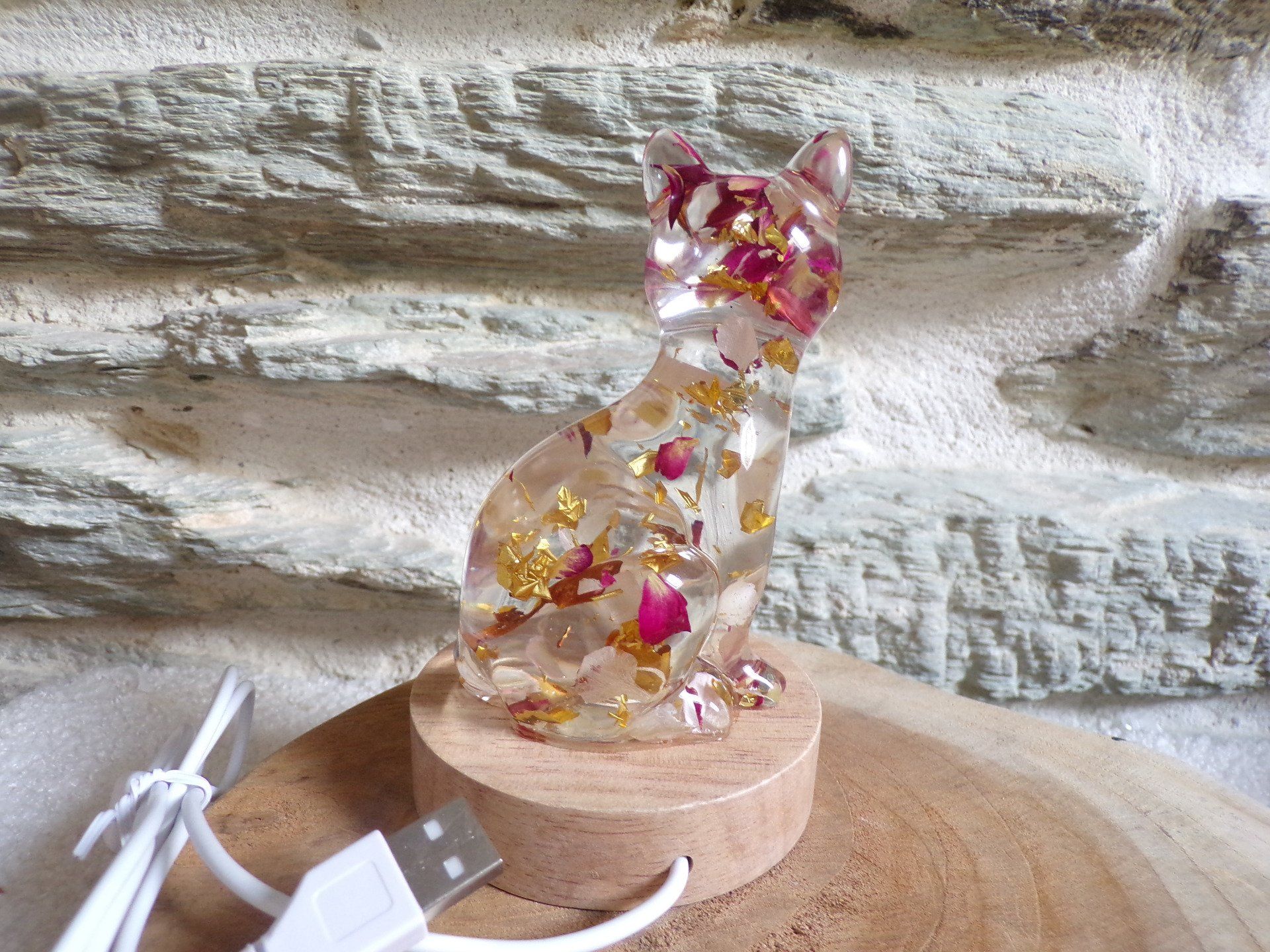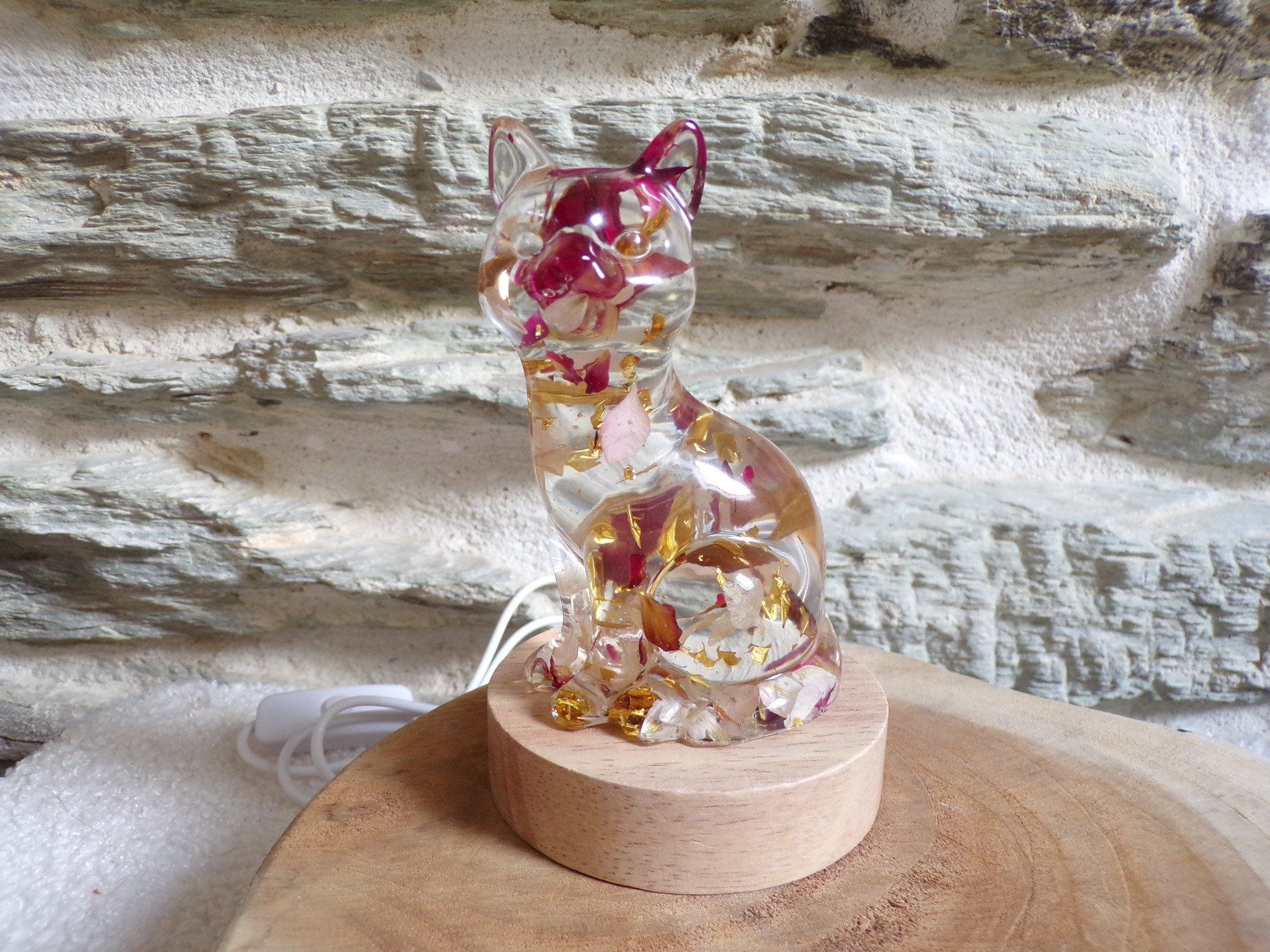 Chat en résine sur socle lumineux pétales roses et bordeaux